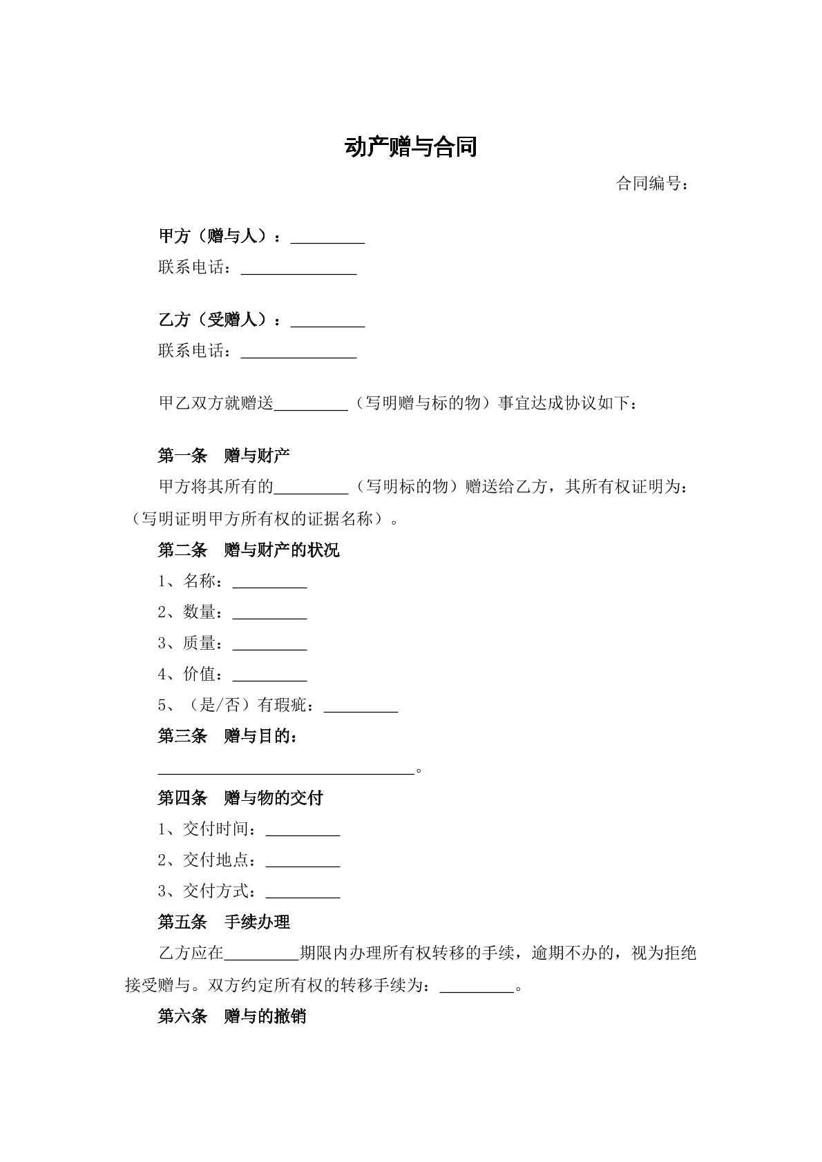 动产赠与合同书